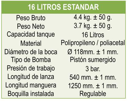 Cuenta con capacidad nominal 16 Lts. con dosificación graduada. En la boca de llenado va una taza filtro fina de llenado rápido. La tapa esta provista de una válvula de aire que impide la salida de líquido y un sistema de agarre para el transporte de la pulverizadora.